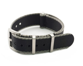 Our premium nylon watch strap in black with grey lines. Made from high tensile strength nylon webbing with luxury hardware, including a premium stainless steel buckle and rectangular stainless steel keepers. Our nylon is heavy weaved for a soft feel (yet strong!!) with a higher sheen than standard NATO straps. Our premium strap that rivals the big boys in quality.